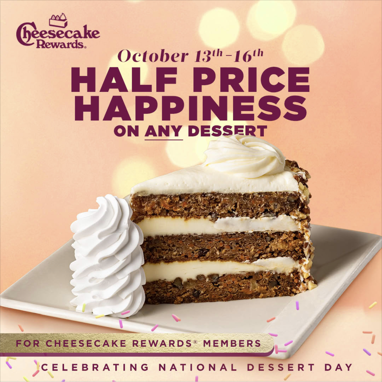 Half price desserts at the Cheesecake Factory from October 13th – 16th! Let’s go! Must be a Cheesecake Rewards member.